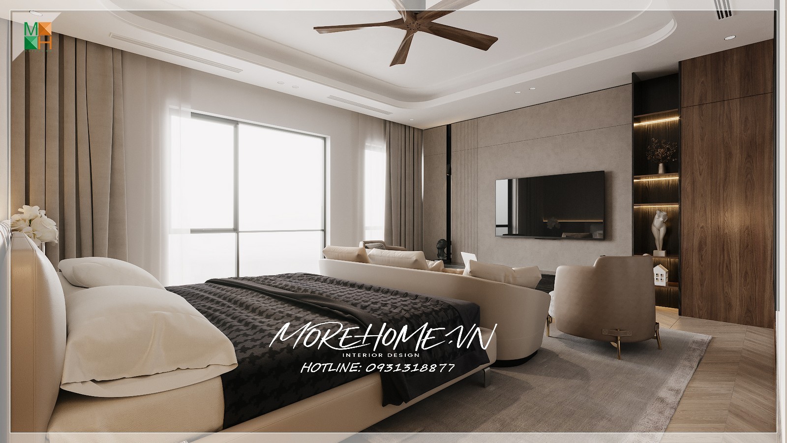 Giường ngủ liền bàn làm việc tông màu nâu trầm phong cách hiện đại, sử dụng ánh sáng tự nhiên nhờ thiết kế cửa sổ lớn bằng kính cường lực, giúp không gian căn phòng được mở rộng hơn