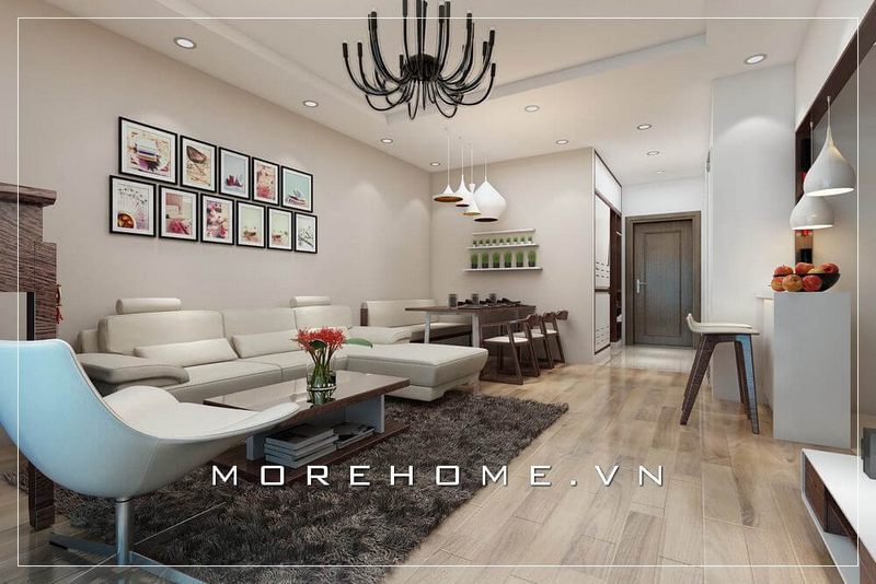 Không gian phòng khách chung cư được sử dụng tone màu trắng tinh tế tạo cảm giác tươi mới và hiện đại cho không gian căn hộ