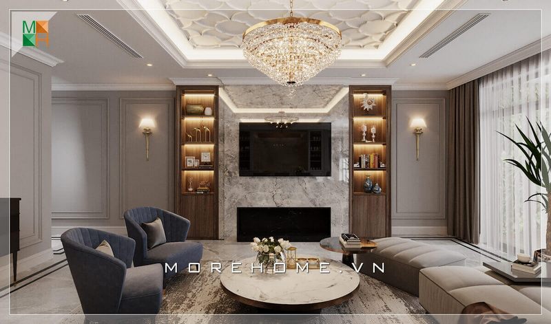 Để tạo ra một không gian phòng khách biệt thự, nhà phố tân cổ điển sang trọng thì không thể không kể đến những chi tiết nhỏ như rèm cửa, kệ TV, đèn chùm treo trần nhà, hay là những chạm khắc điêu luyện của trần nhà hết sức tinh tế. Đó là sự kết hợp hoàn hảo để tạo ra một không gian phòng khách mang phong cách tân cổ điển cao cấp.
