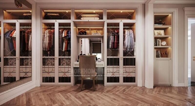 Hệ thống tủ quần áo và kệ tủ đều làm bằng gỗ sồi phun sơn trắng với những chi tiết góc cạnh tân cổ điển