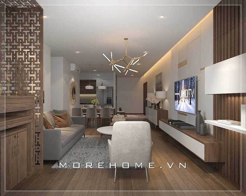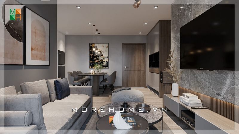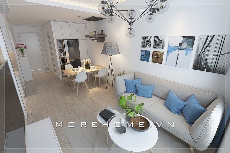 Tối ưu không gian phòng khách căn hộ chung cư nhỏ với mẫu sofa vải êm ái thiết kế theo kiểu dáng văng tiện lợi của phong cách hiện đại.