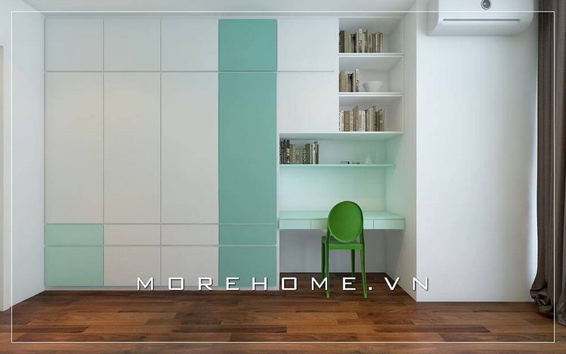 Hệ tủ quần áo hiện đại được thiết kế nối liền với bàn học, tạo hiệu ứng cho căn phòng thêm rộng rãi hơn
