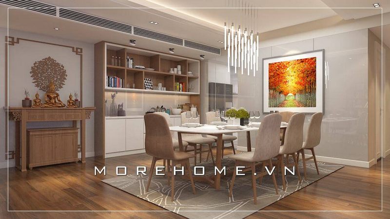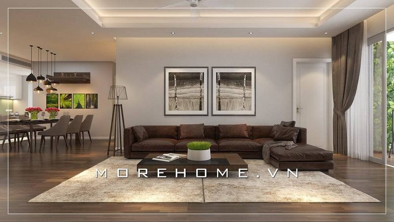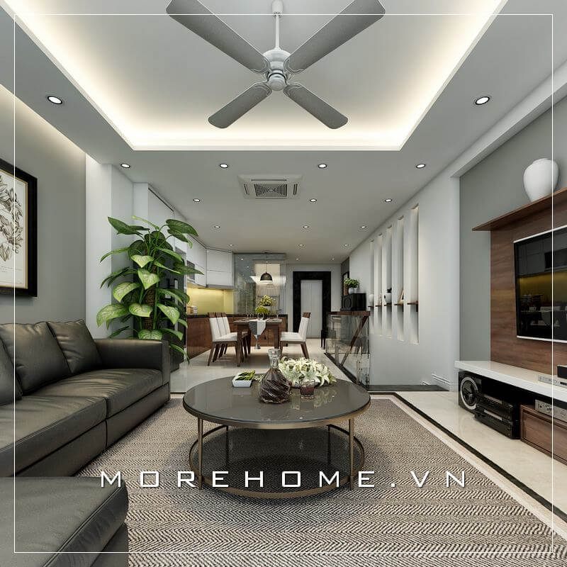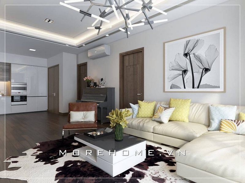 Mẫu thiết kế phòng khách chung cư đẹp, các kiến trúc sư Morehome sử dụng các hình khối đơn giản và cụ thể mang đến sự rõ ràng và thuận tiện cho gia chủ