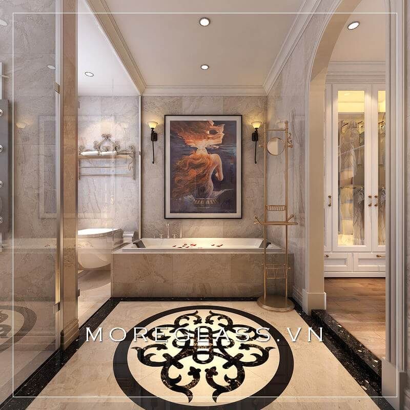 Phòng tắm được trang trí đặc biệt bằng mẫu đá ốp sàn tự nhiên với hình dáng hoa văn độc đáo, khiến người ta không thể cưỡng lại được.