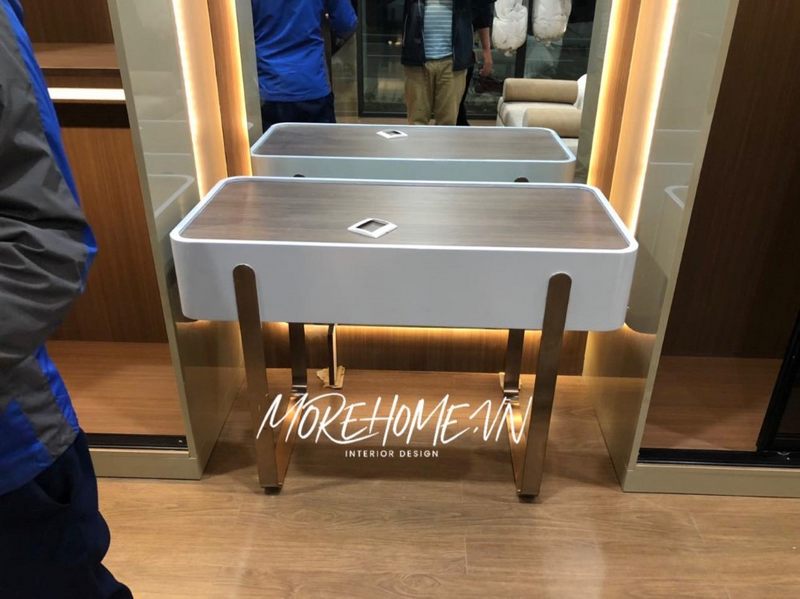 Mẫu bàn trang điểm độc đáo có khung bàn bằng gỗ công nghiệp kết hợp với chân inox mạ vàng hiện đại cao cấp.