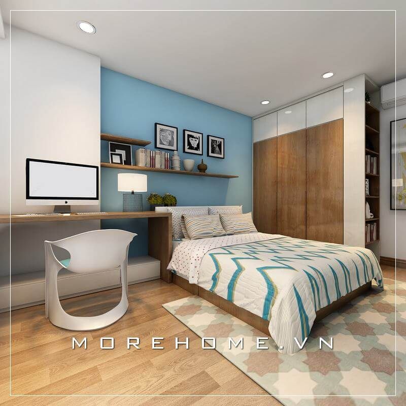 . Mẫu thiết kế nội thất phòng ngủ chung cư đơn giản nhưng hiện đại, bàn làm việc được kết hợp với giường ngủ sẽ giúp cho gia chủ cảm nhận được sự thoải mái và tiện dụng hơn.